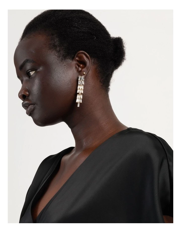 Leave a lasting impression with a pair of stunning drop earrings. These earrings have a tiered design, adorned with eye catching baguette stones on a gold toned setting. Pair with your favourite evening wear for an event ready ensemble.